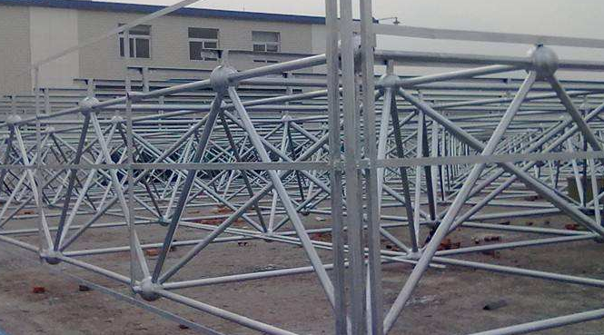 1、在网架结构节点处,调整与切割件轴端相对应的螺孔后,将高强度螺栓插入构件中,形成整个网架结构。钢球的硬度可略低于螺杆,材料强度也低于螺杆。